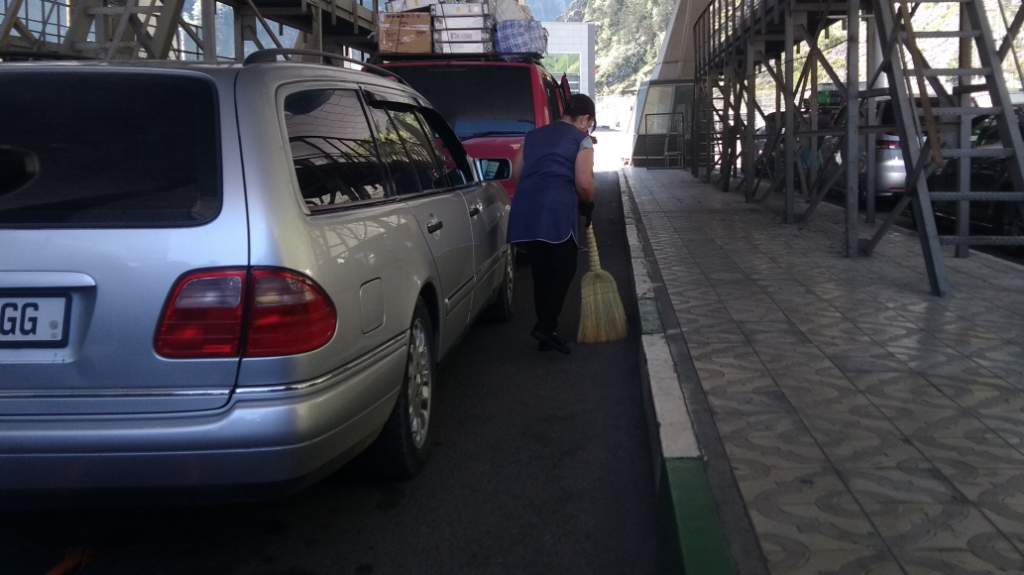 Allerdings heißt es danach, dass wir nochmal rechts ran fahren sollen. Wir müssen warten bis einer in zivil mit unseren Pässen auftaucht. Er ist uns fleißig am ausfragen. Woher, wohin, wo wir arbeiten … dann muss er im Büro noch was prüfen. Langsam find ich es komisch. Dann schlappt er an und drückt uns die Pässe in die Hände – endlich. Die Georgier sind dann super fix. Keine Schlage, ein Mann mach Zoll und Immigration. Ruckzuck sind wir fertig.