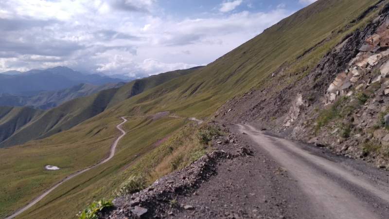 Ich will heute noch tiefer in die kaukasischen Berge. Also noch schnell tanken und dann links abbiegen. Da geht eine kleine Straße über 100 Kilometer in die Berge. Die ersten 30 davon sind noch Teer, dann fängt der Schotter an. Es ist herrlich. Wetter perfekt, die Straße atemberaubend. Die Straße wird mit jedem Kilometer schmäler. Anspruchsvoll, aber fein und gut zu fahren.