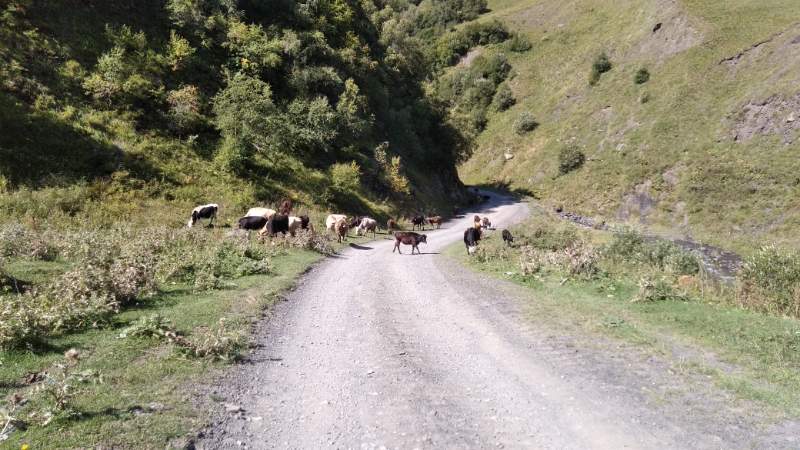 Unten angekommen, schnell tanken und etwas die Berge entlang fahren. Die gewählte Straße entpuppt sich als mieser Weg durch die kaukasischen Hügel. Mir aber egal, mit der AT macht das durchaus Spass.