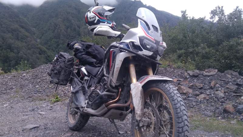 Die Landschaft ist überwältigend ursprünglich und mich überkommt eine große Dankbarkeit, dass ich das sehen darf. Aber nicht lange. Nach 5 Kilometer gemütlichem Gehopel ist Schluss mit irgendwelchen Gedanken. 100 Prozent Konzentration ist angesagt. Die Straße ist in den Fels gehauen und es geht über Felsstufen bergan. Wasser läuft überall herunter und rechts geht es in die Tiefe. Es ist super anspruchsvoll und es braucht vollen Einsatz immer die richtige Spur zu erwischen. Überall liegen kleine und große Steine von Felsstürzen. Und da der gemeine Felssturz hier nicht die Ausnahme sondern die Regel ist, steht im weiteren Verlauf der Straße alle 5 bis 10 Kilometer eine Uralt-Raupe die im Fall des Falles alles wegräumt.