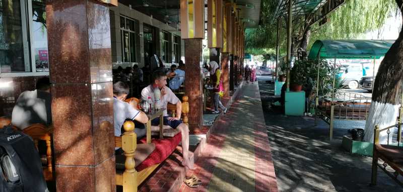 Wir sind gegen acht Uhr auf den Beinen, weil wir hoffen, dass es im Restaurant auch Frühstück geben wird. Doch entgegen der Aussage der Bedienung von gestern Abend ist der Laden geschlossen. Also Planänderung, erst einmal packen und aufrödeln, dann tanken und dann nach einem Lokal suchen. Auf der Hauptstraße wurden wir dann schnell fündig. Leider gabs keine Tische mit normalen Stühlen, sondern nur Diwane, aber egal, das Essen war wichtiger als bequemes Sitzen! Und es gab diesmal nicht das Standard-Frühstück, sondern Schaschlik Kebab, Brot, Salat, Tee, Cola und Spiegeleier. Eben eine richtige Portion für Moppedfahrer!