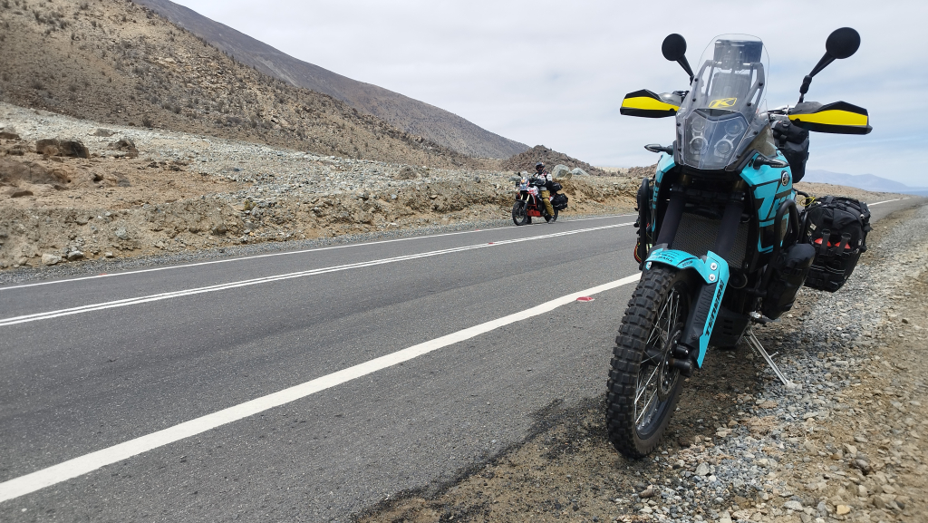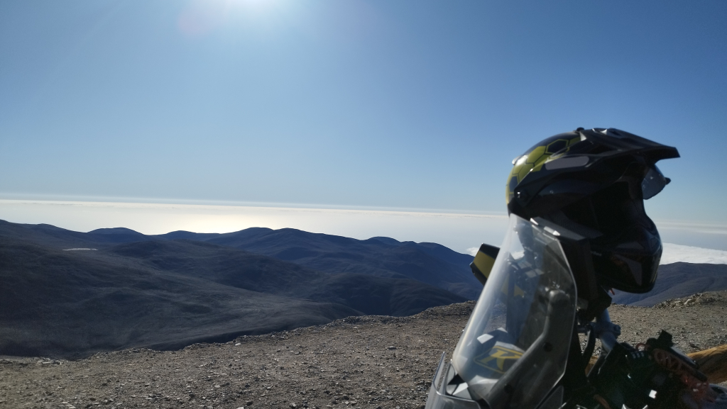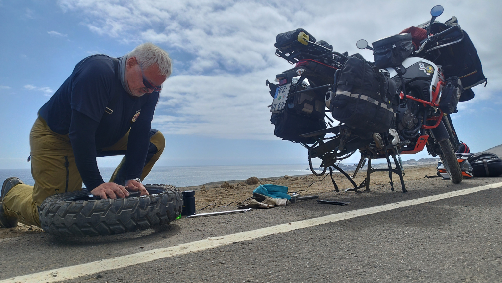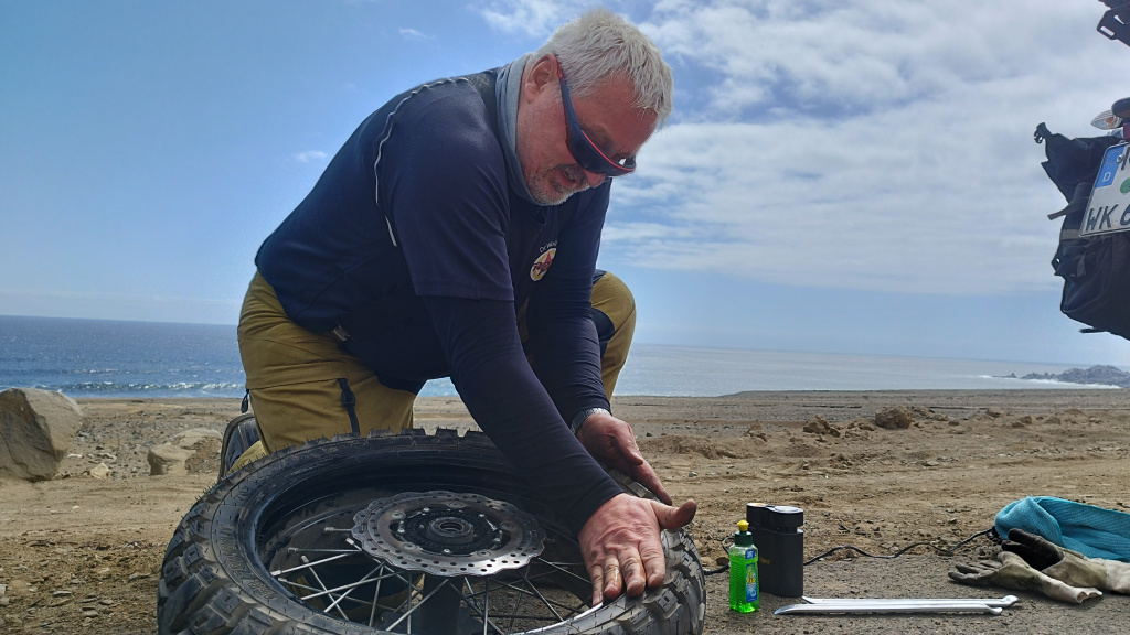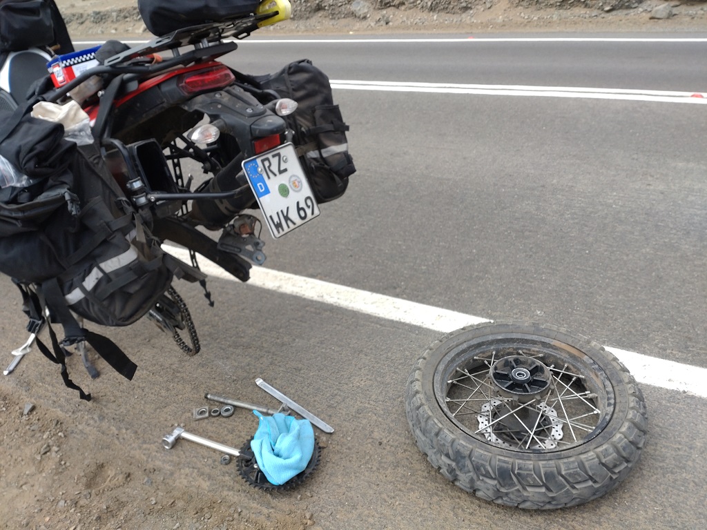 Keine Beschädigungen am Reifen zu erkennen, also erst einmal das Ventil gewechselt, den Kompressor raus geholt und gepumpt, aber ohne Erfolg. Also Rad ausbauen und Schlauch wechseln. Schnell das Werkzeug rausgeholt und vereint ans Werk. Das Rad war schnell draußen, aber Reifen war recht hartnäckig, aber mit Tobias „Bed-Breaker“ haben wir es dann gut hinbekommen und den Schlauch rausgeholt. Auf der Innenseite an der Naht war ein 1 cm langer Riss, aber weder auf der Felge noch am Reifen war irgendetwas zu erkennen, was das verursacht haben könnte. Also neuen Schlauch raus und eingebaut, Rad eingebaut und nach ca. 1,5 Stunden sind wir wieder unterwegs. Die ersten Kilometer etwas vorsichtiger, aber als sich alles als Okay erwies wieder in normalem Tempo. Am Ende der Ruta1 ging es noch mal einen schönen Pass hinauf, wo wir dann an der Passhöhe unsere Sticker hinterließen und eine wunderschöne Aussicht genießen konnten.