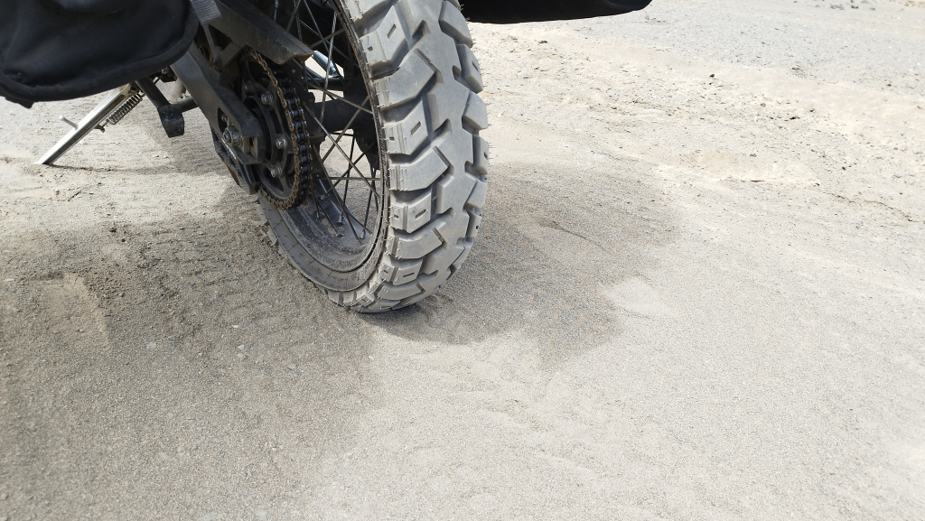 Gelegentlich kam uns ein Auto entgegen, ansonsten hatten wir die Strecke für uns Allein. Ab und an gab es ein paar kleine Fischersiedlungen, die aber nicht sonderlich einladend aussahen. An einer Stelle mit Strand wollten wir dann dichter ans Meer, aber die Piste wurde schnell sehr sandig und so drehten wir um. Dabei fiel Tobias auf, dass ich einen Plattfuß hatte.