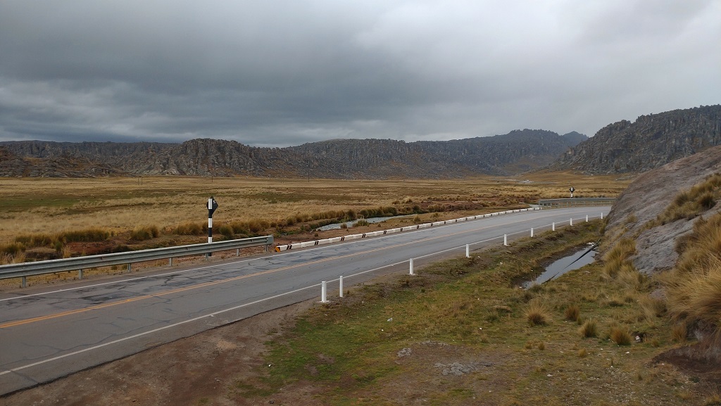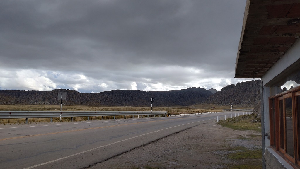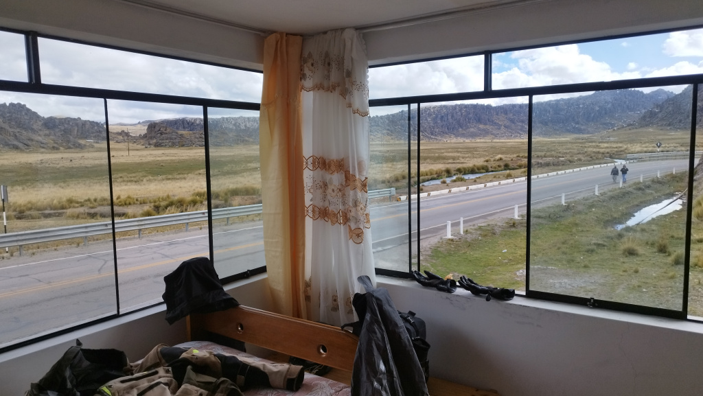 Nach rund 150 km machten wir eine Pause und betankten Mensch und Maschine. Da es verstärkt nach Regen aussah haben wir auch gleich die Regenklamotten angezogen. An sich war die Tour soweit unspektakulär und so haben wir keine Fotos gemacht sondern sind einfach gefahren. Die Straße hat sich dann langsam auf über 4000 m hochgeschraubt und natürlich war es dann vorbei mit den „Dschungeltemperaturen“. Kurz vor Huayllay gab es noch einige bizarre Felsformationen zu bestaunen, aber ich hatte keine Lust, bei gerade einmal 5° die Handschuhe für ein paar Fotos auszuziehen. In Huayllay haben wir dann beschlossen hier zu übernachten, weil es sehr nach Regen aussah und wir nicht sicher über den Zustand der weiteren Strecke waren. Irgendwie gelang es uns aber nicht, in einem der insgesamt 5 Hotels ein Zimmer zu bekommen. Nach einer guten Stunde vergeblicher Suche such wir dann ca. 8 km zurück gefahren und haben dort ein schönes Zimmer mit genialem Ausblick bekommen.