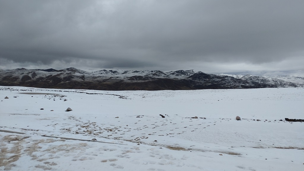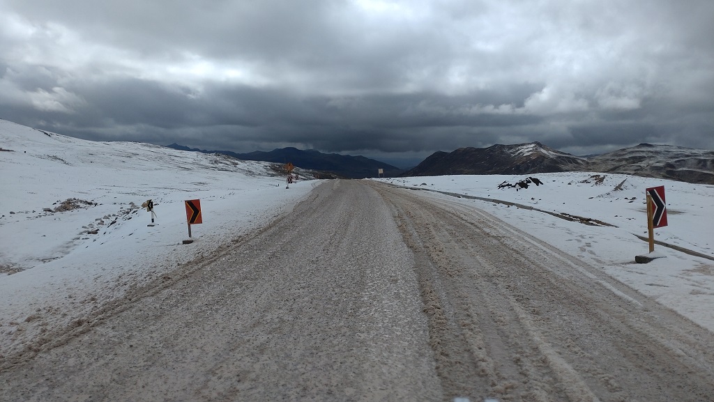 Nicht nur die Piste war frisch geschoben, es war jede Menge schweres Gerät im Einsatz, um aus der Piste eine breite Asphaltstraße zu machen. Es war eine spannende Landschaft und wir sahen zum ersten Mal seit wir in Peru sind Neuschnee, und zwar recht viel, auch auf der Piste.