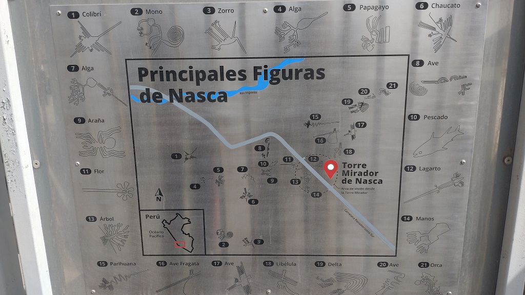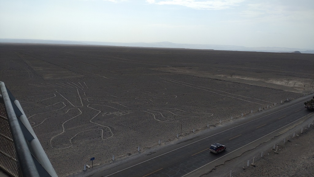 Zum Glück reicht der Autobahnartige Ausbau bis Guadeloupe, also knapp 100 km vor Nasca. Kurz vor Nasca erreichen wir den Aussichtsturm bei den berühmten Geoglyphen von Nasca. Natürlich klettern wir auf den Turm und bewundern die drei von hier aus sichtbaren Bilder. Irgendwie schon beeindruckend, keine Frage. Einen Rundflug schenke ich mir, da ich nicht wirklich Vertrauen in den technischen Zustand der Flieger hier habe.