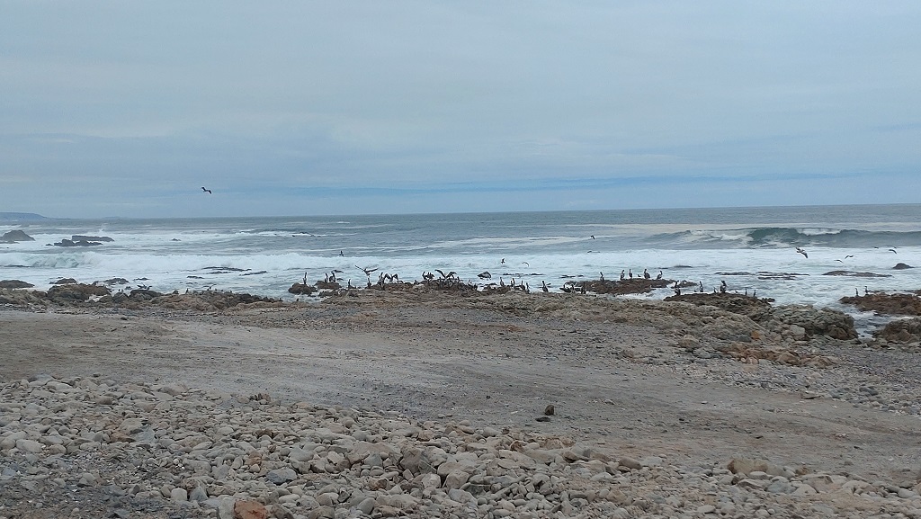 Wieder zurück auf der Straße geht es wie gewohnt weiter und wir genießen den geringen Verkehr und die Aussicht. Später kommen wir an einer Stelle vorbei, wo es zum ersten Mal seit drei Tagen Seevögel zu sehen gibt. Bisher sahen wir nur Geier, aber keine Seemöwen oder ähnliche Seevögel. Diesmal eine ganze Kolonie von Pelikanen, die auf den Uferfelsen sitzen. Sie lassen uns auf 50 m rankommen und dann steigen sie auf. Weil wir stehen bleiben sind sie 2 Minuten später wieder gelandet.