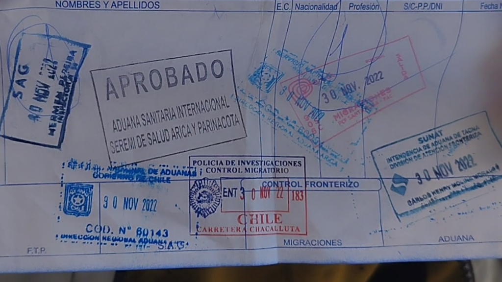 7: Sunat Chile, hier wird drauf geachtet, dass keine frischen Lebensmittel und Obst eingeführt werden. Diesmal reichte der Stempel von der Gepäckkontrolle.