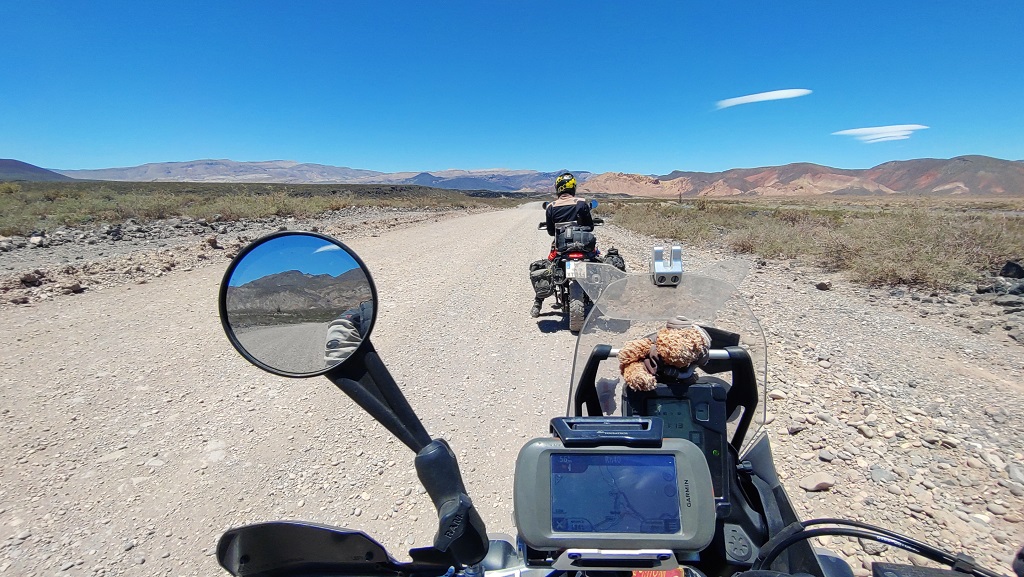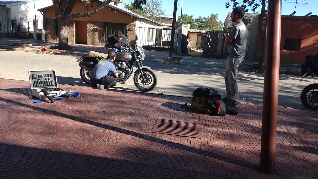 Zum Glück konnte einer der Argentinier englisch, was die Kommunikation deutlich vereinfachte. Da ich als Ausländer betroffen war wurde dann noch die Spurensicherung angefordert. Die gingen dann auch professionell ans Werk. Bei den Motorrädern waren aber keine Fingerabdrücke zu finden, weil die Sturzbügel halt keine ebene Fläche haben. Aber am Auto des Hoteliers haben sie einige Fingerabdrücke gefunden. Die Strapse sahen so aus, als wenn sie mit einer Zange durchgekniffen wurden.