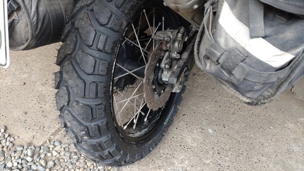 Sogar passende Hinterreifen waren vorrätig. Ich habe mich dann für einen Mitas E 07 entschieden, der auch gleich montiert wurde. Der Mitas hat ein ähnliches Profil wie der alte Heidenau K60 Scout, ist also auch gut für Schotter geeignet.