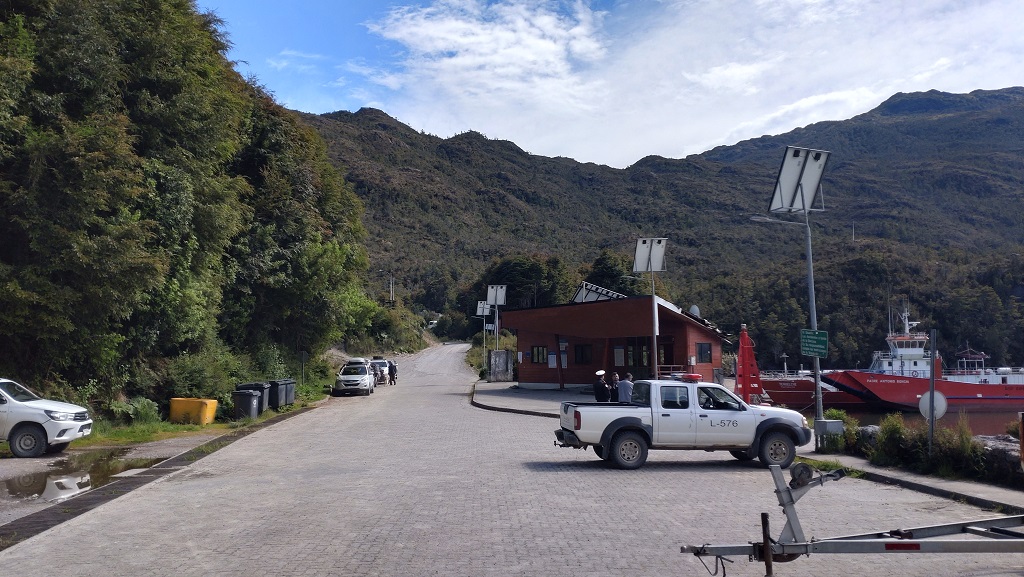 Die Fähre tuckerte dann gemütlich über den Fjord, so hatten wir ausreichend Zeit die Ufer zu bewundern. Nach 45 Minuten erreichten wir dann Rio Bravo, den anderen Anleger. Hier war noch weniger los als in Caleta Yungay, außer dass sie hier wohl den Anleger erneuern.