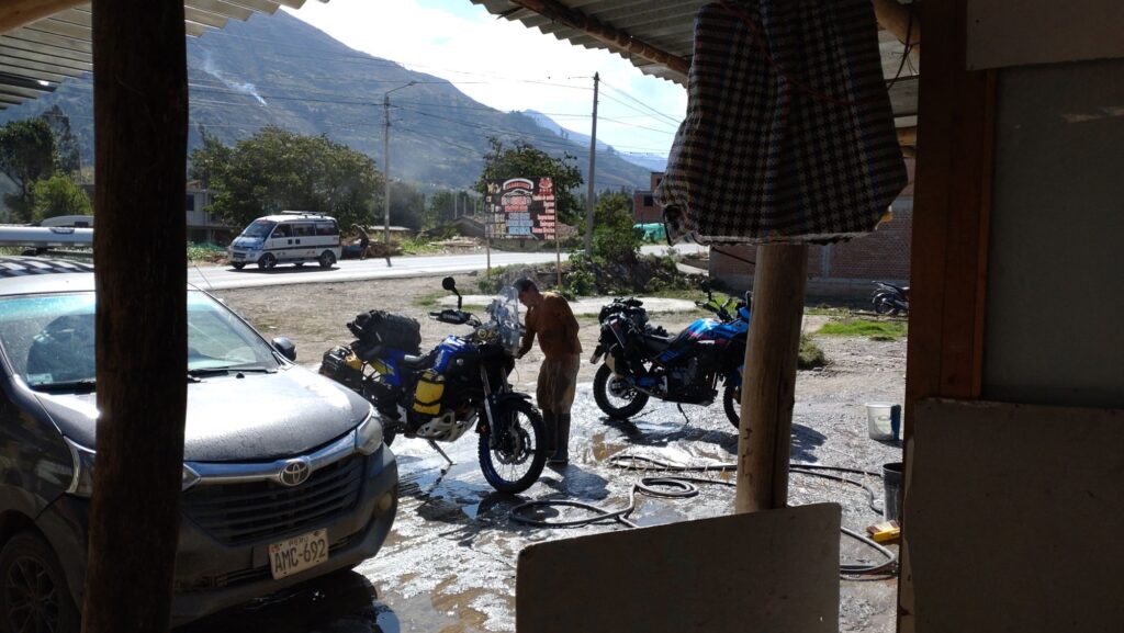 Kurz vor der Abzweigung kamen wir noch an einem liegengebliebenen Tieflader mit einem Bagger drauf vorbei, der die Straße für alles außer Motos blockierte. Ein Ort später fuhren wir zum Hauptplatz, holten uns ein Eis und guckten nach Unterkünften. Nachdem die Auswahl getroffen war ging’s es weiter bis zu einer Llavaderia de Moto, wo wir unsere ziemlich staubigen und verdreckten Moppeds waschen ließen. Die Jungs waren richtig gründlich und zum Abschluss gab’s noch ein Duftwässerchen für die Moppeds.