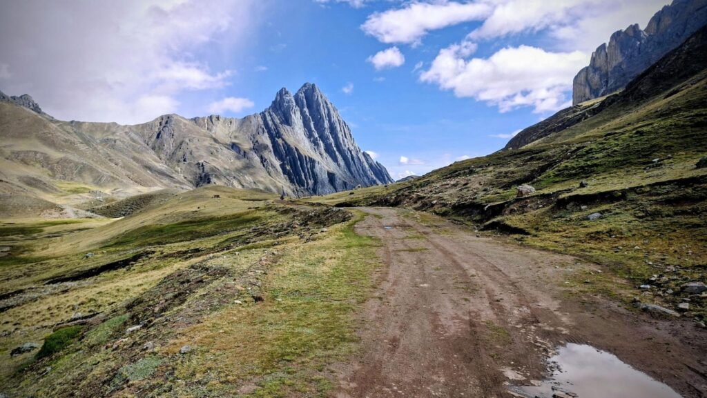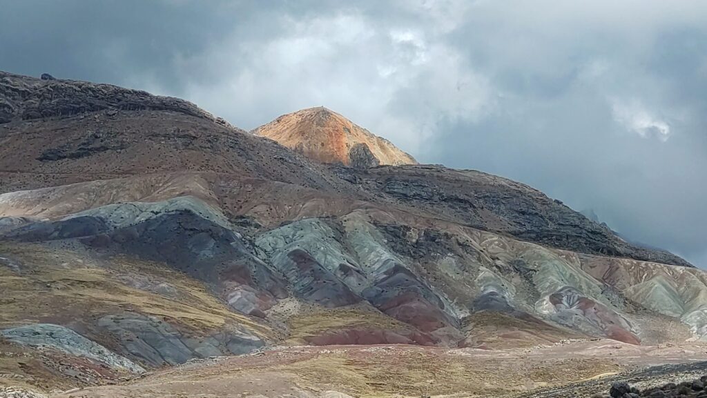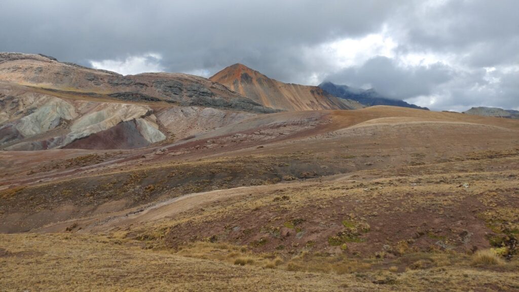 Und jetzt wurde es wirklich schön. Wir arbeiteten uns auf 4800 m hoch und waren wegen der tollen Aussichten wahrlich geflasht! Ein Berg mit vielen Farben, eine Bergspitzen in Gelb und überhaupt. Und dann gab es auch noch Lamas, endlich! Wir dachten schon, sie wären hier ausgestorben. Leider waren sie zu weit weg für ein gutes Foto.