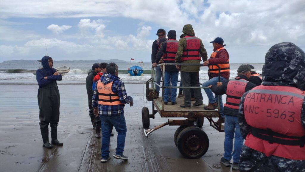 Genau, es gab ja nur den Strand und viele Wellen, wir hätten also nasse Füße bekommen, aber mit diesen Rollwägen sind wir trockenen Fußes in die Boote gekommen.