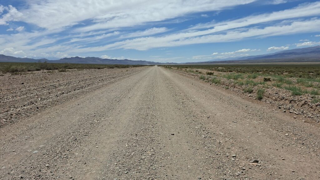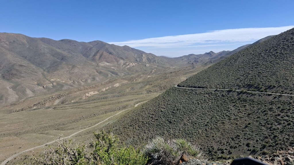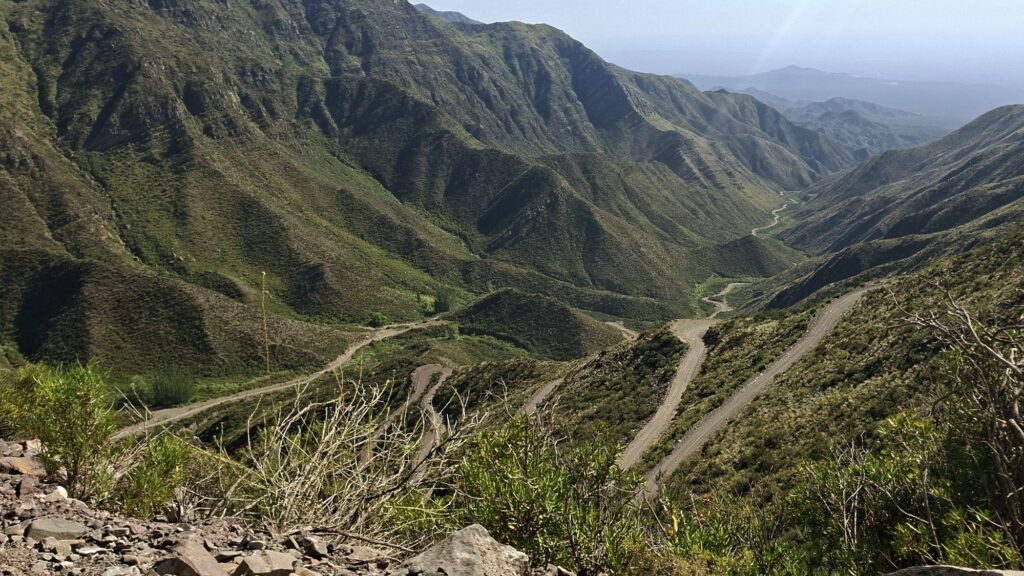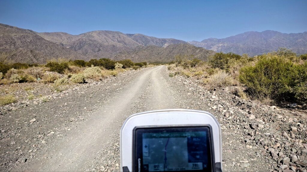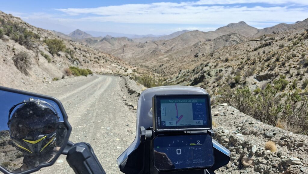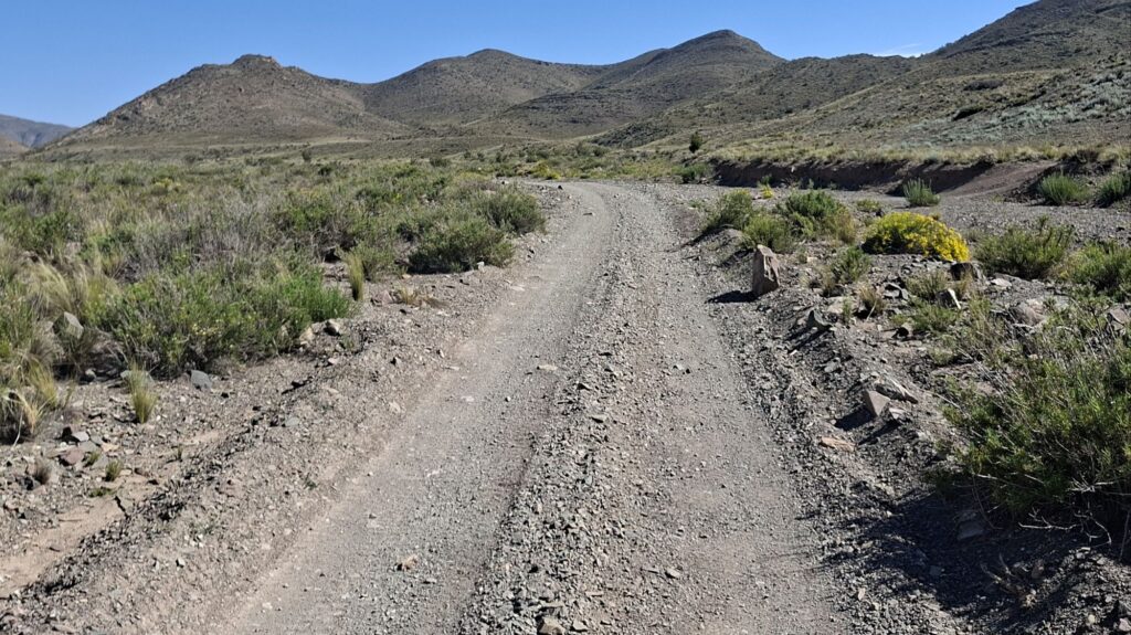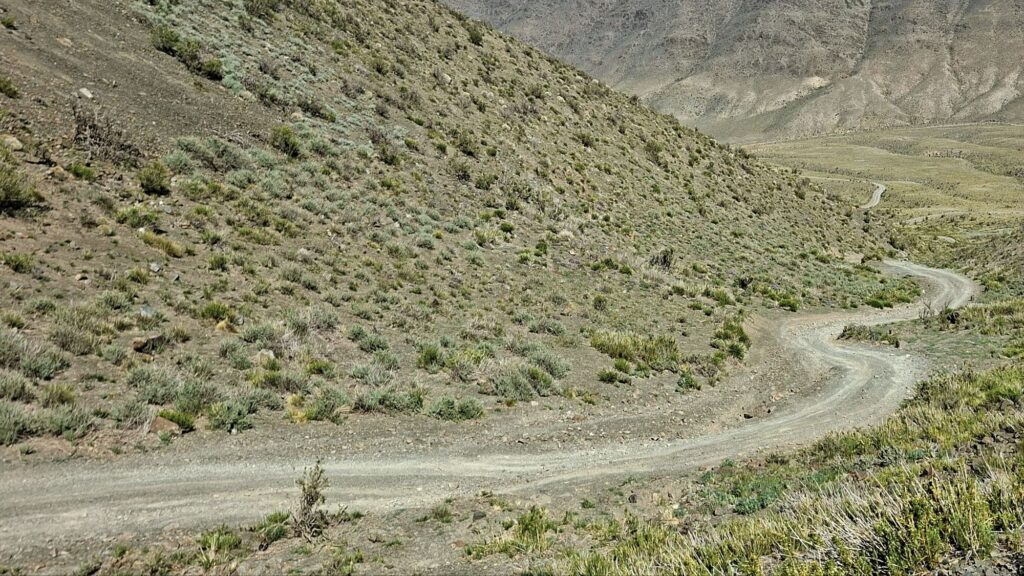 Jetzt gibt es aber gleich mal wieder Piste. Die fängt sofort hinter Mendoza an. Knapp 90 Kilometer, ordentlich durch die Berge und laut Satellit nicht ganz so einfach. So kann man z.B. erkennen, dass es teilweise 5 Steckenvarianten auf den steilen Stücken gibt. Mal sehen.
