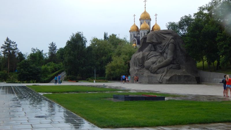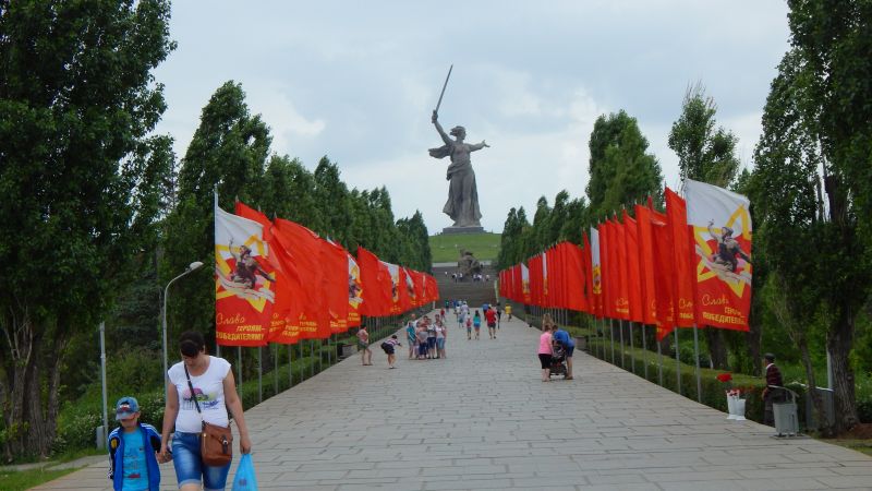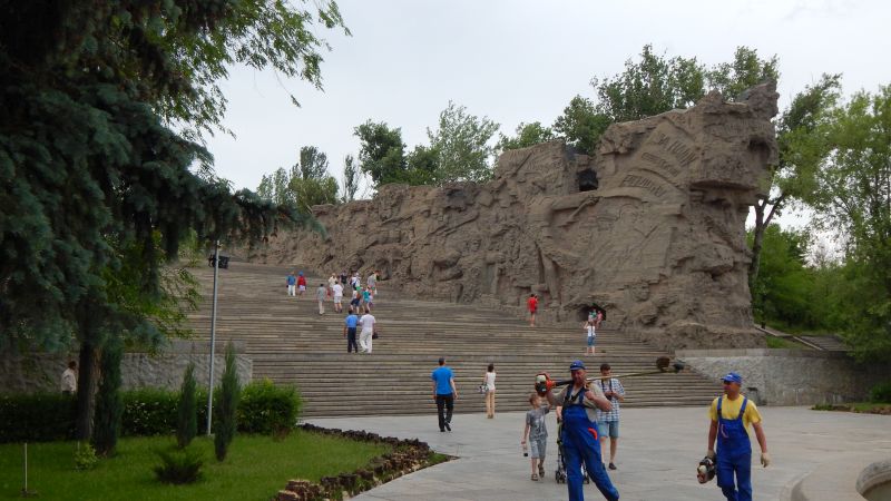 05.06.2015 – Heute war unser erster Pausentag und eine Stadtbesichtigung stand auf der Agenda. Das heißt, eigentlich sollte es zum Marmajew Kurgan und zum Volga – Ufer gehen. Auf meinen Wunsch sind wir dann dort hin gelaufen und den Berg bis zur Statue Mat Rodina hoch. Ich muss schon sagen, dieses monumentale Denkmal hat mich sehr beeindruckt, zumal ich die Geschichte vom Kampf um Stalingrad ziemlich gut kenne. Besonders die Ehrenhalle mit den Tafeln der Gefallenen, der ewigen Flamme und den dort stehenden Ehrenposten war zutiefst beeindruckend.