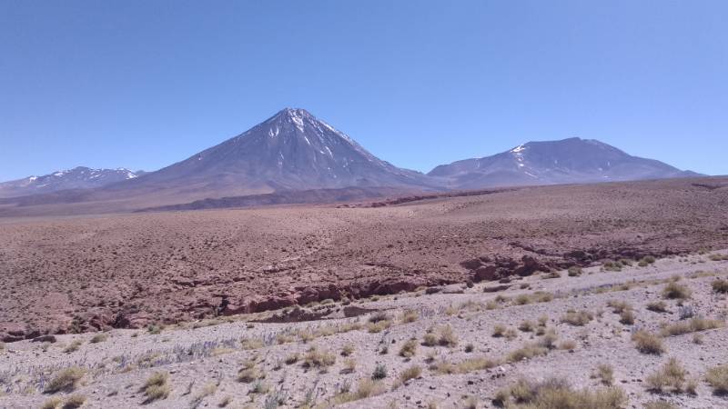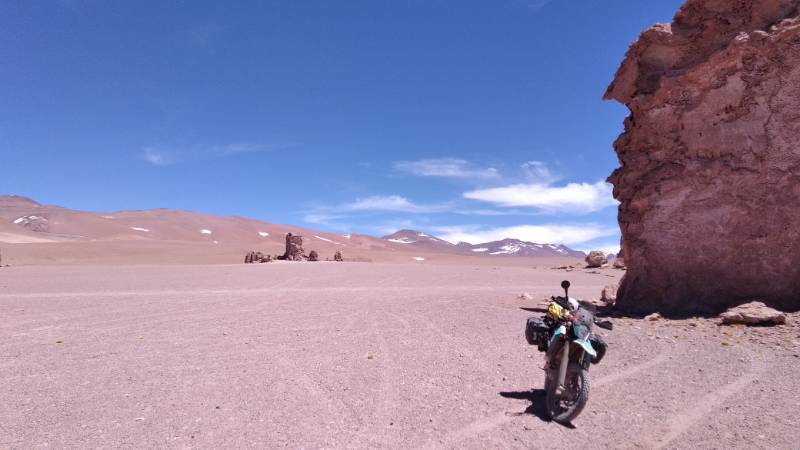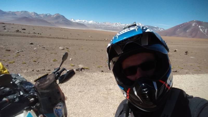 Für mich geht es zügiger voran. Trotzdem treffe ich die Beiden den ganzen Tag, weil ich mehr Stopps mache. Es sind 100 Kilometer bis zur Grenze, alles weit über 4000 Meter. Gar bis 4800 geht es hoch. Die Landschaft grandios. Eigentlich will ich schnell zur Grenze, aber ich muss immer wieder Abstecher in die Pampa machen um Fotos zu schießen. An einer Lagune auf 4300 Meter sehe ich Flamingos. Sehr komische Vögel, was machen die da. Die halbe Lagune ist gefroren.