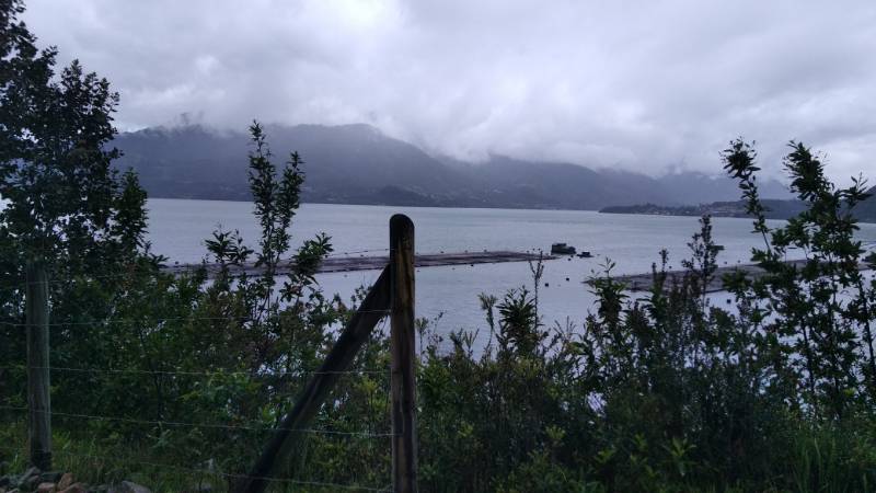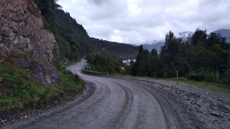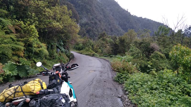Ich muss zu einer Stadt an der die Straße zunächst endet. Von dort geht es nur mit der Fähre weiter. Die fährt einmal am Tag, also erst morgen wieder. Weil ich Zeit habe und die Laune ja prächtig ist, nehme ich die längere Route mit Pisten-Anteil, trotz Regen.