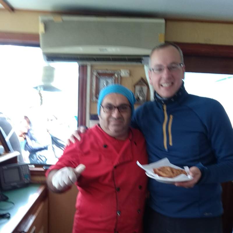 Weil ich meine Sache so gut mache, wird der Küchenchef gerufen und ich bekomme Mittagessen. Ich lobe die Mahlzeit über den Klee und bekomme zum Dank gar noch Nachtisch.