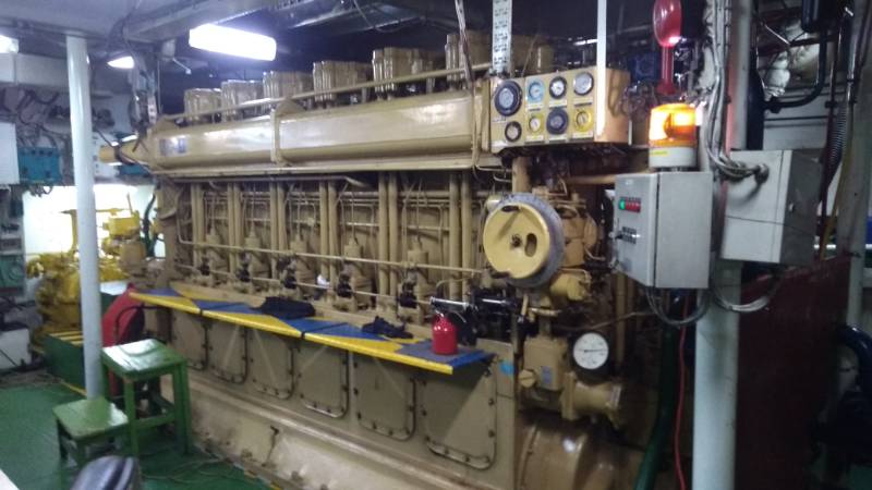 Ich sitze gerade so rum und schaue aufs Meer, da kommt einer von der Schiffs-Crew. Der Maschinist wie sich später herausstellt. Ein Zweiter gesellt sich dazu und wir kommen ins plaudern. Als ich in frage wieviele Zylinder seine Maschine hat sagt er „komm mit“. Dann bekomme ich eine Führung durch den Maschienenraum. Also Führung? Ich darf mal hier drehen und da ölen …