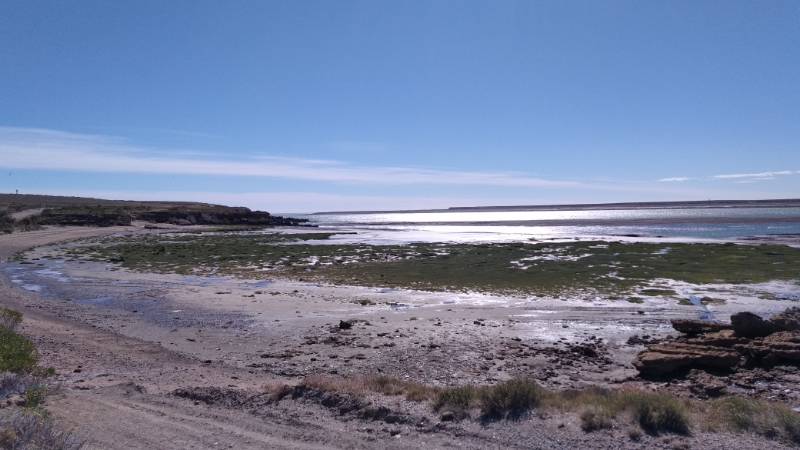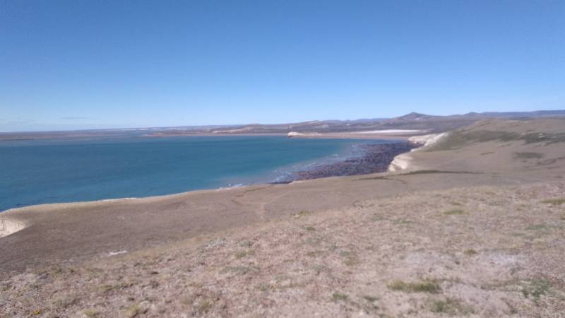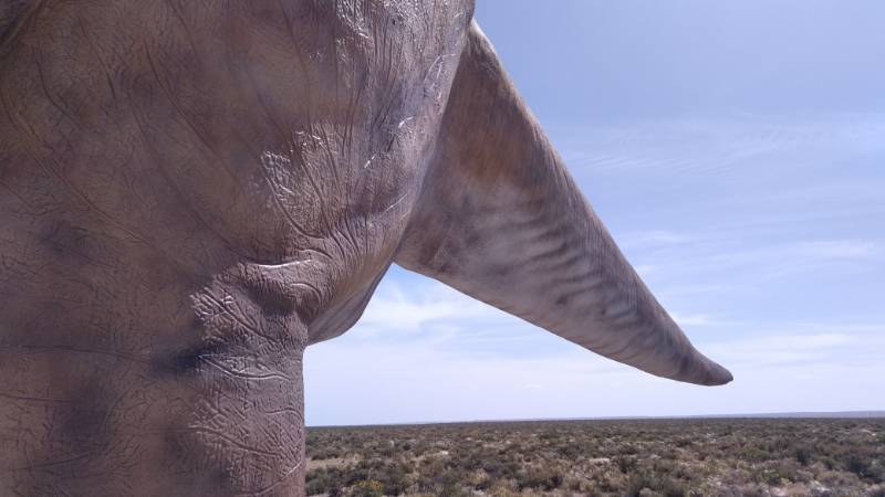 Ich brauche eine Weile bis ich mich mit dem neuen Plan anfreunden kann. Aber Windstille und tolle Aussicht entlang der Küste helfen. Es geht 500 Kilometer durch die Steppe. Es hat praktisch nichts auf der Strecke. Ach doch, einen Dinosaurier.
