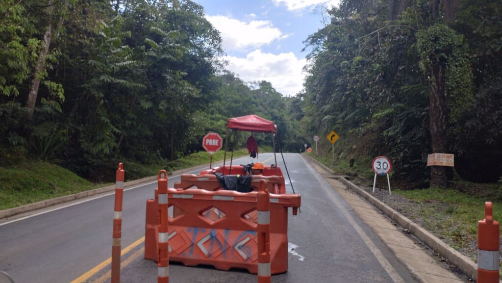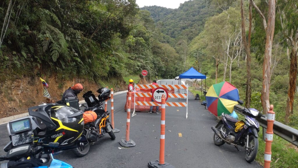 Man gut dass wir heute gut in der Zeit lagen. Also Helm ab und Pause. Ein fleißiger Kolumbianer war auch schon da und Kaffe und Empanadas. Auch wir griffen zu. Nach ner knappen halben Stunde kam der Gegenverkehr an und es wurde unruhig. Also Klamotten an und abfahrbereit machen. Gerade waren wir fertig ging es auch schon los. Es war eine ziemlich lange Baustelle mit jeder Menge Technik und Personal im Einsatz.
