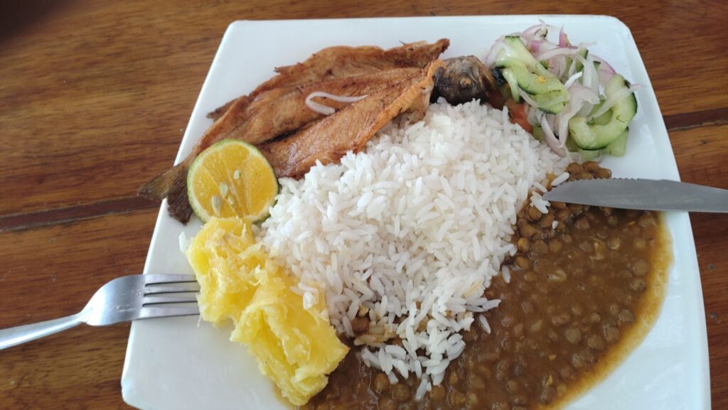Wir sind dann zum Mittag in einer Raststätte eingekehrt. Es gab Trucha mit Reis, Süßkartoffel und etwas Gemüse.