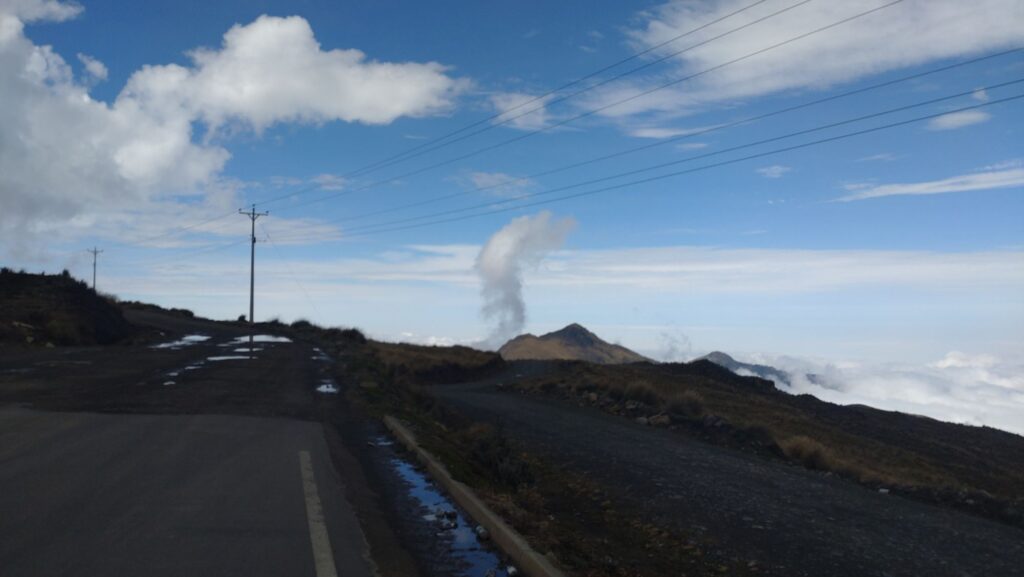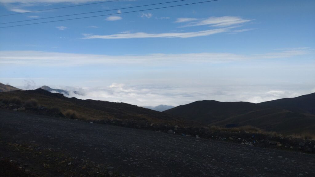 Tja, als wenn das nicht genug war gerieten wir in die Wolken, zunächst gar nicht schlimm, aber dann wurden sie Dichter und es kam leichter Sprühregen auf. Also anhalten und Regenklamotten überziehen. Zu allem Überfluß wurde die Sicht so schlecht, dass wir kaum den Verlauf der Straße sehen konnten. Auf 10 m konnte ich teilweise nicht einmal Tobias Rücklicht sehen. So ging es dann langsam die letzten Kilometer nach Simiatug, immer noch bergauf und bergab. Zwischendurch wurde die Sicht mal besser aber kurz darauf waren wir wieder in den Wolken.