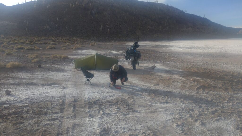 Mit dem Aufstehen haben wir uns Zeit gelassen bis die Sonne die Zelte einigermaßen erwärmt hat. Dann hat Tobias den Kocher angeschmissen für den Kaffee und wir hatten unser typisches Salar-Frühstück mit Kuchen.