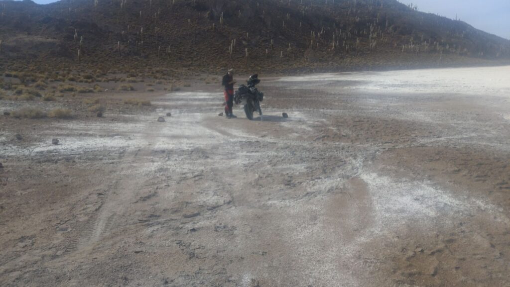 Raus aus Uyuni ging’s dann erst einmal auf einer ziemlich kaputten Asphaltstraße, die sich dann aber in eine gute Straße „verwandelte“. So ging es gemütlich dahin durch „Apachen Land“ zum Tagesziel in Alota, wo wir uns eine Bleibe suchten. Letztlich landeten wir in einer der Herbergen, die auch die Tourbetreiber ansteuerten. Das Zimmer war okay, es gab heißes Wasser und auch Abendessen und Frühstück. Passt also. Beim Abendessen haben wir noch eine Bolivianerin kenne gelernt, die hier Touristen begleitet auf der Lagunenroute. Das war schon interessant, weil die Toyota Hilux von hier aus in drei Stunden zur Grenze nach Chile donnern, um dort die Touristen abzuholen. Sie meinte dann, Motos würden 5 Stunden brauchen.