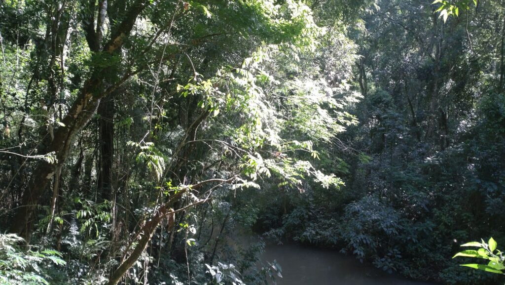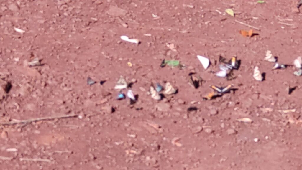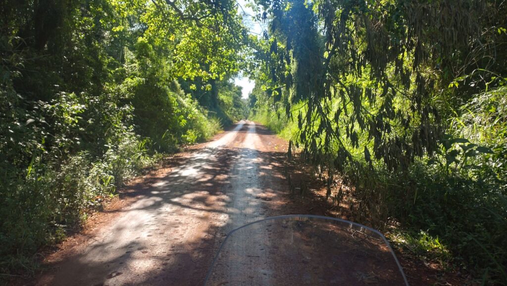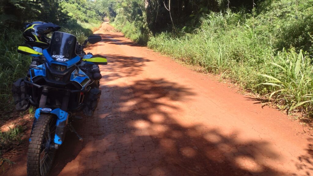 Dann geht es los, hal diese rote Erde wie wie wir sie schon aus Paraguay kennen, aber hier gut festgefahren und nahezu staubfrei. Wir tuckern gemütlich vor uns hin und machen ein zwei Pausen an schattigen Stellen. Ist schon cool, so unmittelbar durch den Dschungel zu fahren. Wir können bei den Pausen sogar noch das Grollen der Wasserfälle hören.