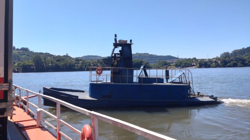 Die Fähre wurde von einem Motorboot angetrieben, dass über eine Deichsel befestigt war. Eine spannende Technik, die ich bis dahin nie gesehen hatte.